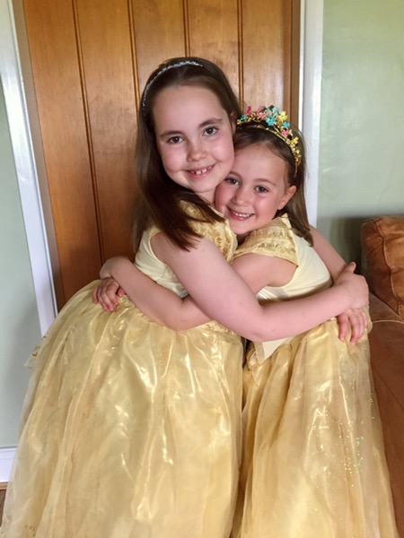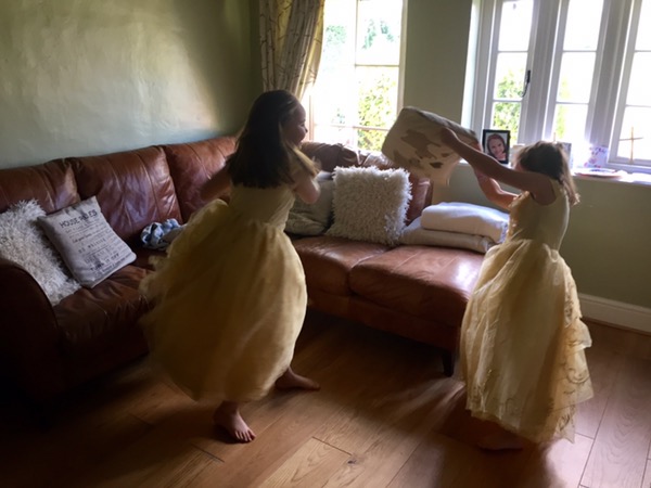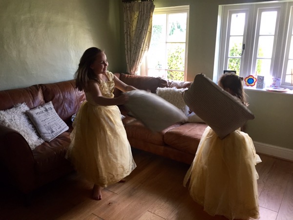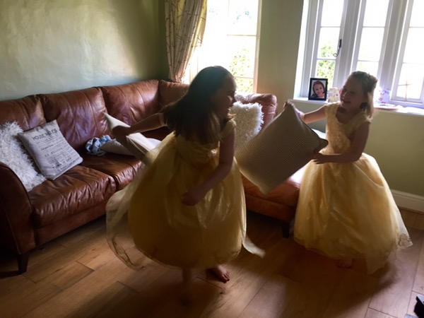 The girls looked so beautiful in their new Belle dresses…until I caught them having a very unprincess-like cushion fight!