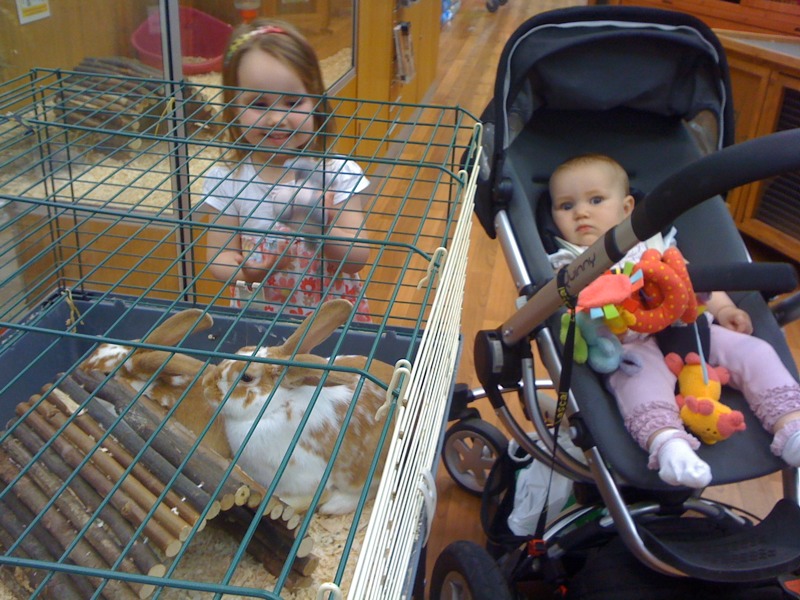 We are at the pet shop buying presents for Marley, Uncle Philip’s puppy. Charlotte wants to take all the rabbits home…!